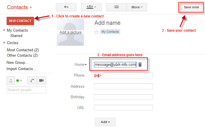 Copy (or register) the address message@ubik-info.com in the e-mail box.