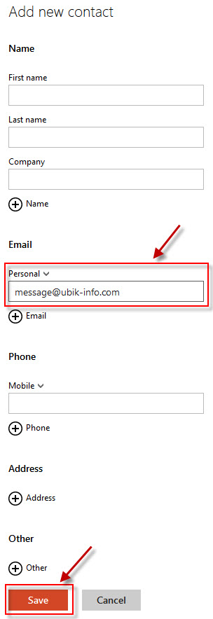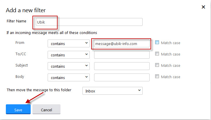 In the 'Inbox', enter the address message@ubik-info.com and click the 'Save' button at the bottom of the form.