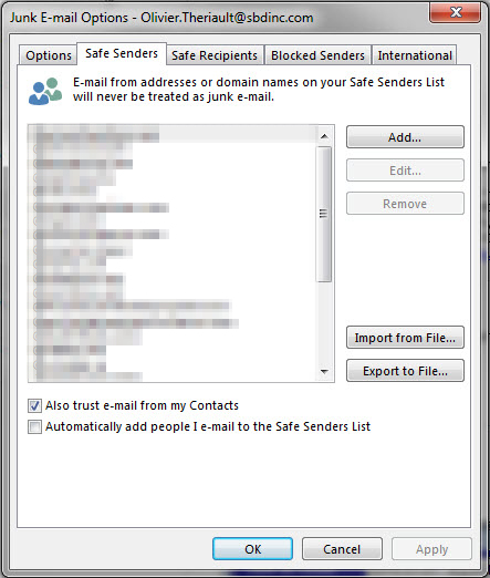 In the 'Safe Senders' tab, click on the option 'Add'.